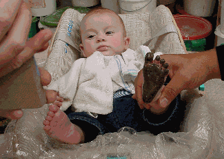 Milan (0 jr.) is klaar voor een voetafdruk. |