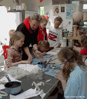 De kinderen uit de nieuwbouwwijk Korpershoek bewerken ieder een eigen tegel. De tegels komen rond de voet van het beeld te liggen. |